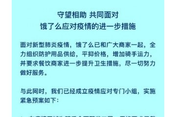 面临新式肺炎疫情,饿了么发布公告称,饿了么已和广阔商家一同,全力安排防护用品供应,平抑价格,添加骑手运力,并要求餐饮商家