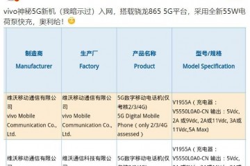 3C 证书查询页面显现,一款型号为 V1955A 的 vivo 手机于 1 月 15 日通过了认证。信息显现这款手机支撑 5G 网络和 55W 快充。据