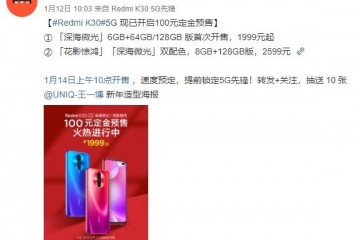 IT之家1月13日音讯 Redmi红米手机早前正式发布新款Redmi K30系列手机,其间Redmi K30 5G已于昨日敞开100元定金预购,6GB内存版别