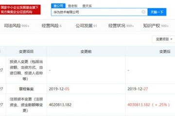 新浪科技讯 1月5日上午音讯,天眼查多个方面数据显现,2019年12月27日,华为技术有限公司注册资本新增,由本来的约402.1亿人