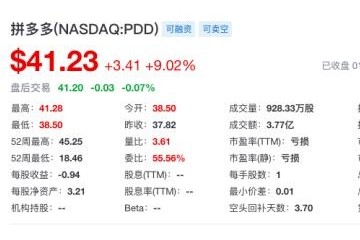 1月3日音讯,拼多多在美股周四的买卖中,股价不断上涨,到收盘大涨9.02%,报收于41.23美元,现在总市值约479.24亿美元。关于拼多