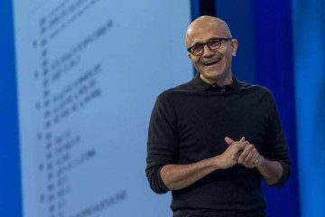 图:2015年4月29日,在美国加州旧金山举办的微软开发者大会上,微软首席执行官萨蒂亚·纳德拉(Satya Nadella)在宗旨会议上宣布说