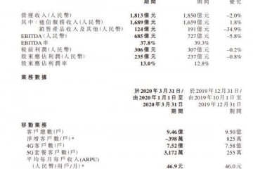 中国网科技4月21日讯 中国移动发布2020年第一季度财报。财报显现,中国移动一季度营运收入为人民币1813亿元,比上年同期下降2.0%