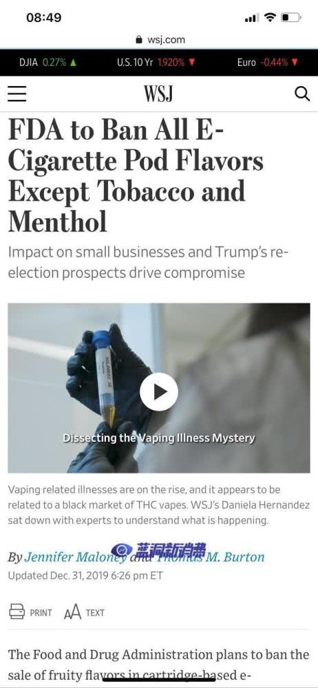 蓝洞新消费报导,1月1日音讯,华尔街日报和华盛顿邮报报导称,美国FDA高级官员表明,特朗普政府将制止出售大多数风味的电子烟烟弹,一起首要保存电子烟商铺的产品。