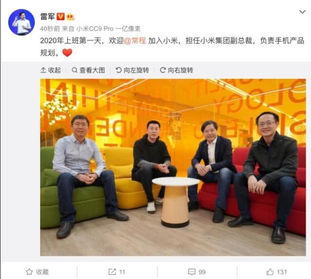 就在刚刚,雷军正式宣告2020年上班第1天, 原联想集团副总裁常程参加小米,将会担任小米集团副总裁,担任手机产品规划!常程之前在联想现已做了19年,实际上也是老将,现在参加小米天然将会给小米带来更多的经历。也有网友戏弄“电磁炉”组合诞生了!
