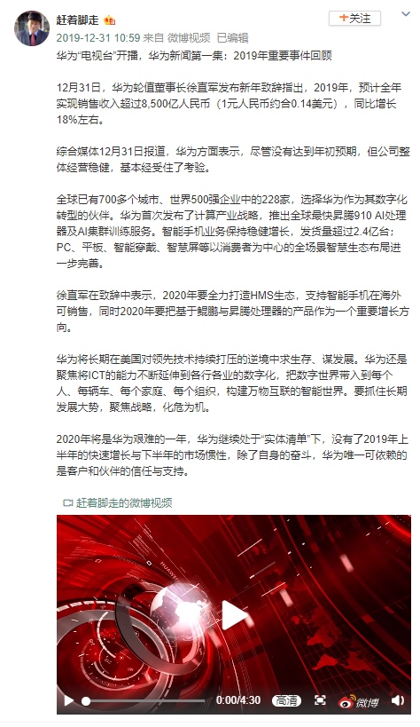 网易科技讯 1月2日音讯,12月31日名为“赶着脚走”的微博用户发布微博,题为“华为“电视台”开播,华为新闻第一集:2019年重要事情回忆”,回忆了2019年华为相关的重要事情。