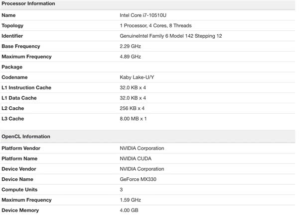 今日,咱们又在GeekBench测验数据库中看到了MX330,来自一台惠普Envy x360翻转本,检测标准显现有3组核算单元,也便是384个流处理器,调配4GB显存(应该是GDDR5),调配十代酷睿i7-10510U。