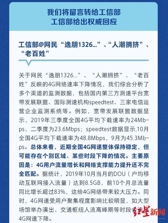 (原题为《工业和信息化部答网民关于“4G网络速率下降”的留言》)