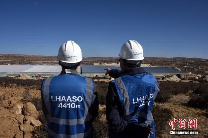 材料图:科研人员在“拉索” 高海拔世界线观测站制高点进行沟通。中新社记者 孙自法 摄