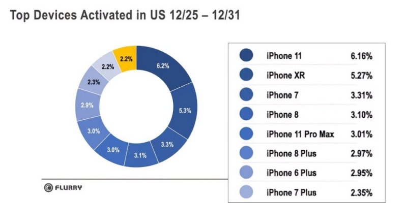 在Flurry Analytics的一份陈述中,苹果凭仗iPhone 11,iPhone 11 Pro和各种老旧机型的健康调配赢得了节日礼物季的冠军,至少在美国,这种老机型在公司中占有主导地位。