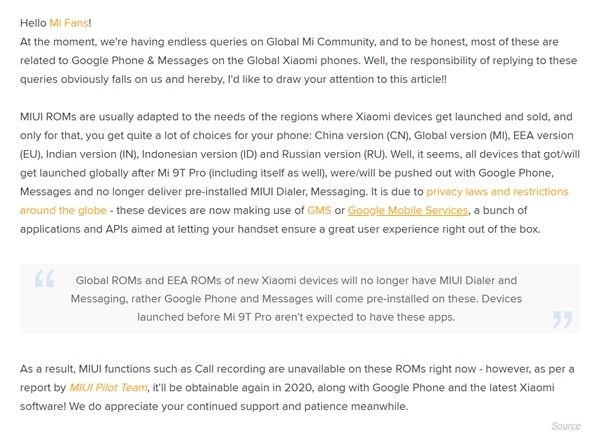 小米表明,小米9T Pro之后的设备在全球范围内都将会预装上述两款应用程序,不再预装MIUI自带的拨号、音讯等APP,该调整是为了恪守当地的隐私方针和法令和法规。与此同时,小米着重这些设备运用的是谷歌移动服务,旨在为用户更好的供给超卓的移动服务体会(小米9T Pro之前的设备不受影响)。