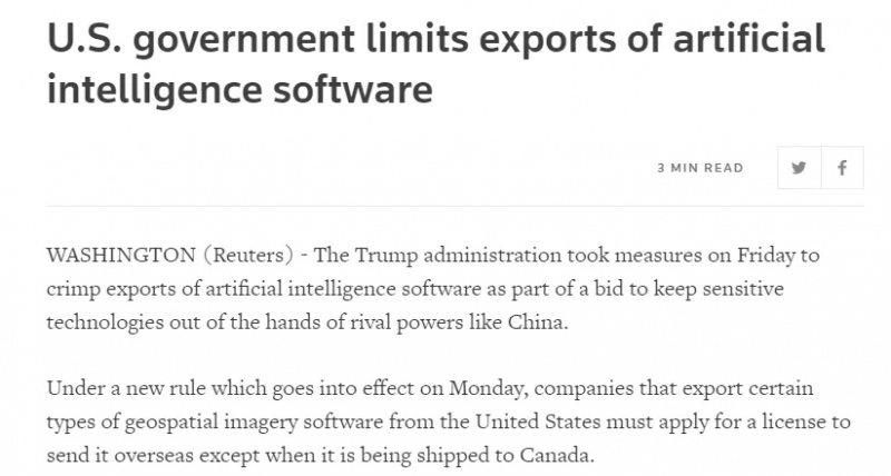 (原标题:美国新规约束人工智能软件出口,针对我国,下周一收效)