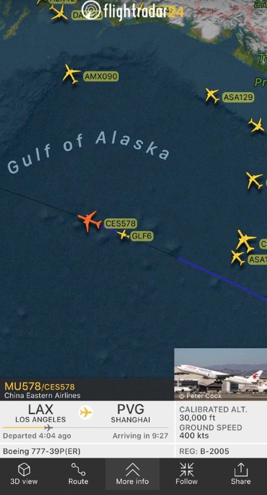 据新闻媒体报道,特斯拉CEO埃隆·马斯克(Elon Musk)今日将前往上海,到会我国制作特斯拉Model 3正式交给客户典礼。因而,有博主依据这些信息,发现昨晚马斯克的私家飞机湾流G650紧随东航洛杉矶-上海MU578航班起飞,并紧紧地跟在后边,不过湾流G650要比东航的波音777飞得更高更快,所以在半途逾越,比民航更早在上海下降。据了解,MU578现已于今日6:33抵达上海。