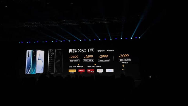 价格方面,realme X50的8GB+128GB版价格2499元,6GB+256GB版价格2699元,12GB+256GB版价格2999元。