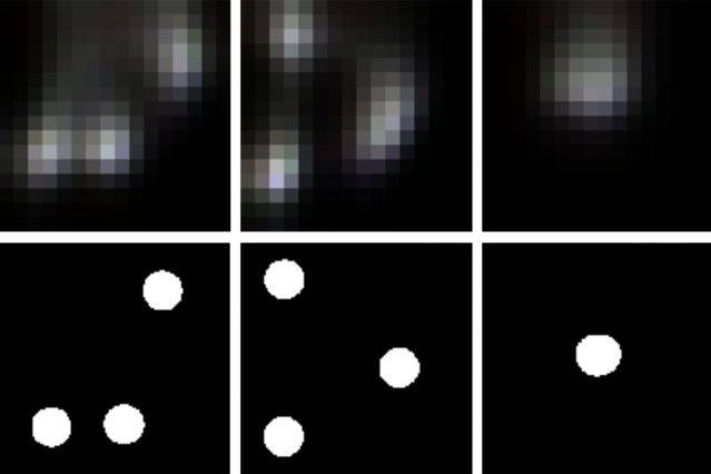 记载下来的画面如下所示(左1)。假如仅凭肉眼调查,这些影子十分凌乱,对咱们简直毫无意义。但研讨人员可经过神经网络对其进行复原。复原效果如下图(右1)所示。乃至色彩都能捕捉到。