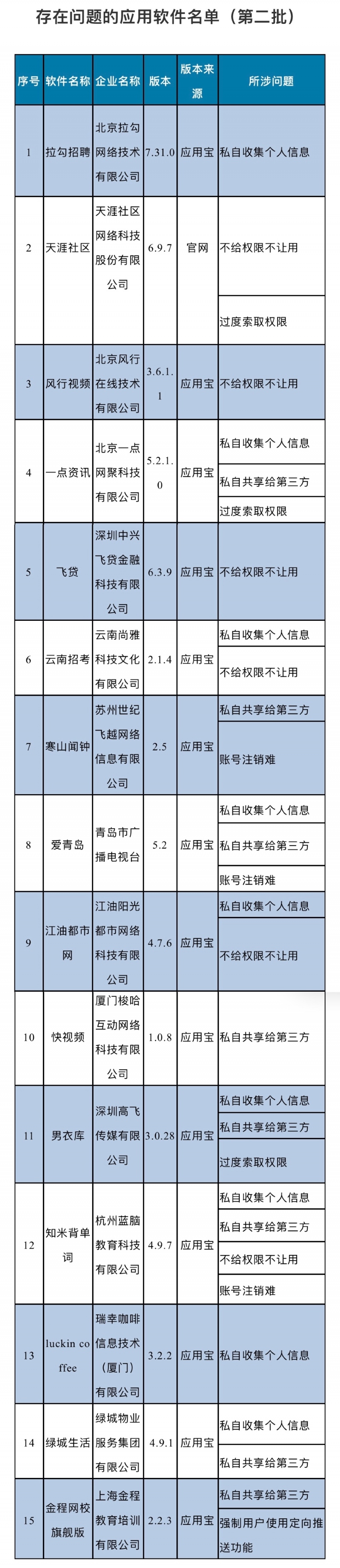 1月8日音讯,工信部将第二批存在问题且未完结整改的15款App进行通报,拉勾招聘、天涯社区、流行视频、luckin coffee、知米背单词等应用在列。