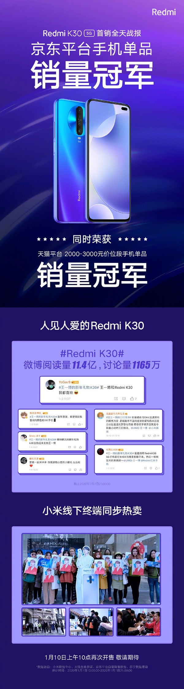 Redmi K30 5G首销当天斩获多渠道单品销量冠军