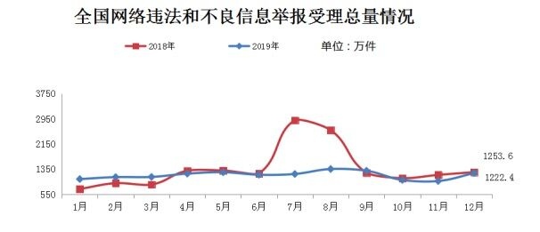 1月8日音讯,据网信我国微信号发布的音讯显现,2019年12月,全国各级网络告发部分受理告发1222.4万件,环比增加25.9%、同比下降2.5%。