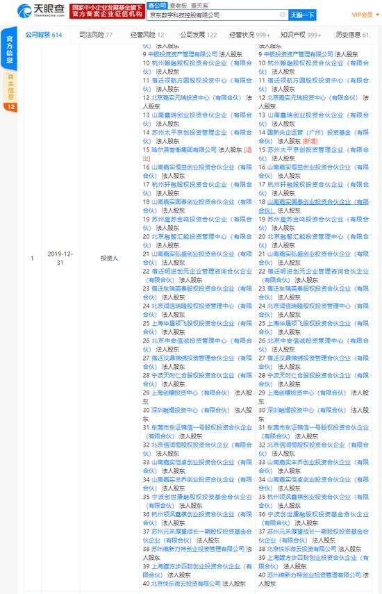 新浪科技讯 1月9日上午音讯,天眼查多个方面数据显现,12月31日,京东数科的运营主体京东数字科技控股有限公司发作工商改变,出资人哈尔滨誉衡集团有限公司退出,新增出资人为国新央企的出资实体之一国新央企运营(广州)出资基金(有限合伙)。