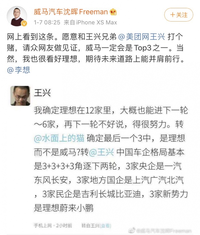 随后,威马轿车董事长沈晖回应表明,在3家新势力中,威马必定会是TOP3之一。一起,沈晖还表明看好抱负,并等待未来道路上能与其并肩前行。