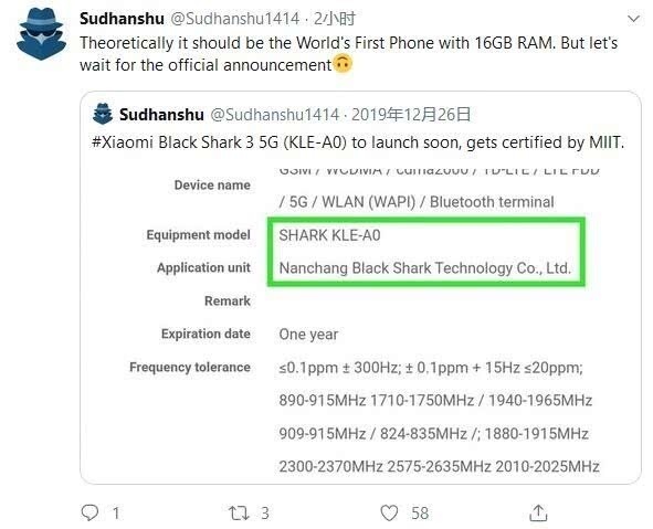 Sudhanshu泄漏黑鲨游戏手机3 5G内存装备