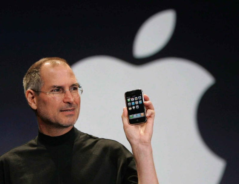 图:在这张2007年1月9日的照片中,苹果CEO史蒂夫·乔布斯在旧金山的Macworld大会宣布主题演讲时,手里拿着一部新iPhone。