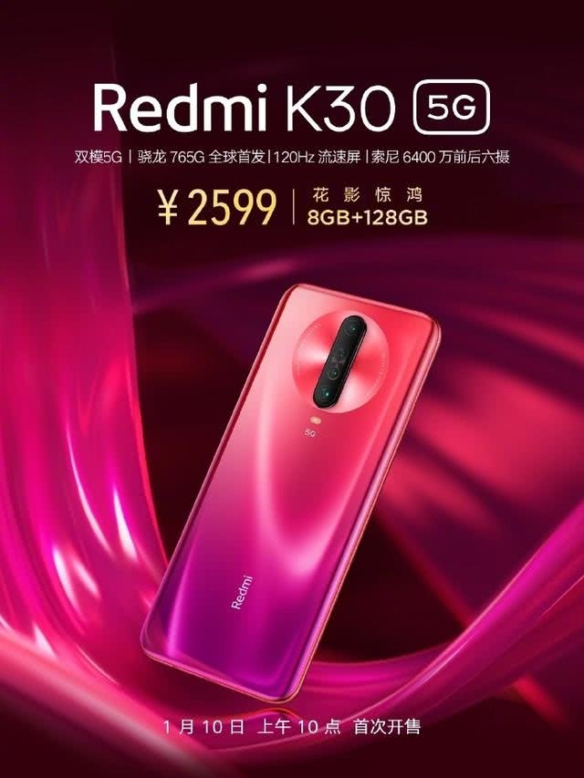 1月7日Redmi K30 5G手机初次开售,宣告2小时全网售罄,今日1月10日上午10:00再次开售,本次新添加“花影惊鸿”配色开售。