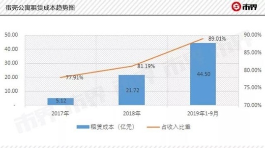 以蛋壳公寓为例,其2017年、2018年和2019年1-9月(以下简称“近三个报告期”)总成本占收入比重分别为141.7%、151.8%和151.3%,其中租赁成本、利息支出、折旧摊销和销售费用成为大头。