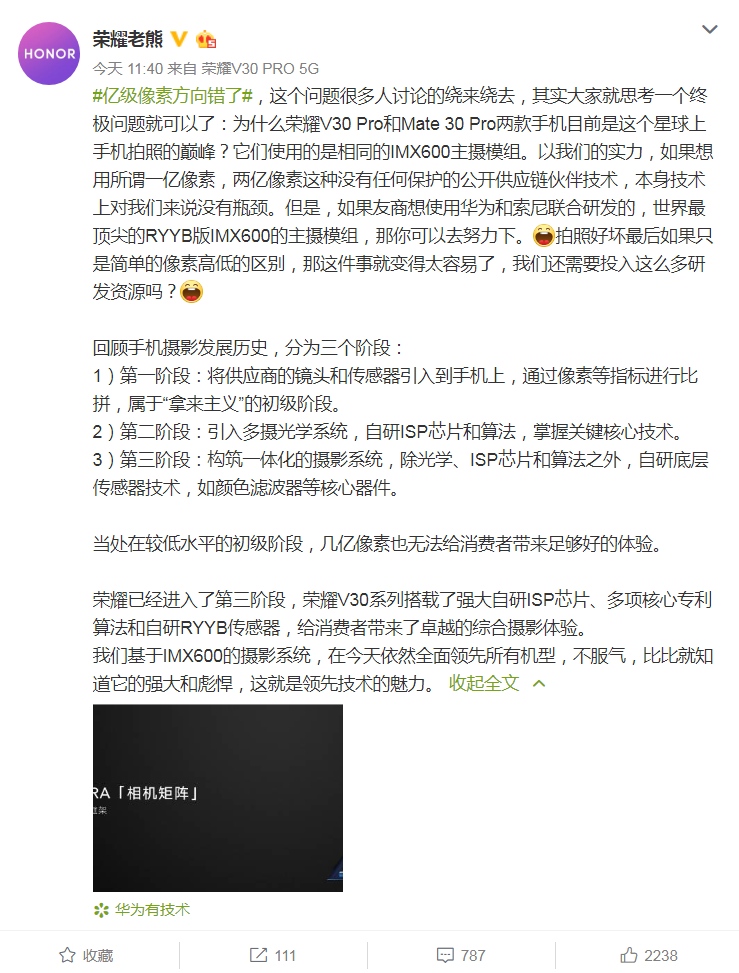 这两天关于红米和荣耀撕逼的点便是在于一亿像素。咱们都知道,一亿像素是小米CC9 Pro首发的,搭载了旗舰级的传感器,成像质量毋庸置疑。可是荣耀老熊就发微博带了个论题,表明亿级像素的方向错了,言下之意便是小米这边的一亿像素更多是噱头罢了,实际上底子没什么大提高,也没有必要比拼这种东西。