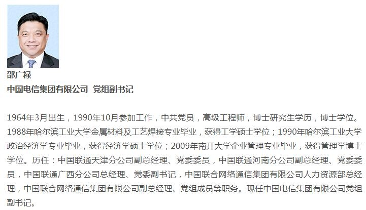 飞象网讯(马秋月/文)音讯称原我国联通集团副总经理邵广禄调任我国电信集团任专职副书记,现在我国电信官网现已更新音讯。