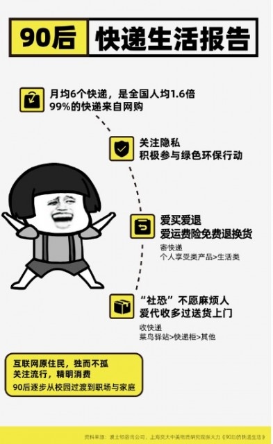陈述数据显现,90后月均收到6个快递,相当于全年72件,这是全国年人均45件的1.6倍。其间99%以上的快递都来自网购,多为美妆服饰、数码电子等个人享用的潮流品,日子类产品相对较少。