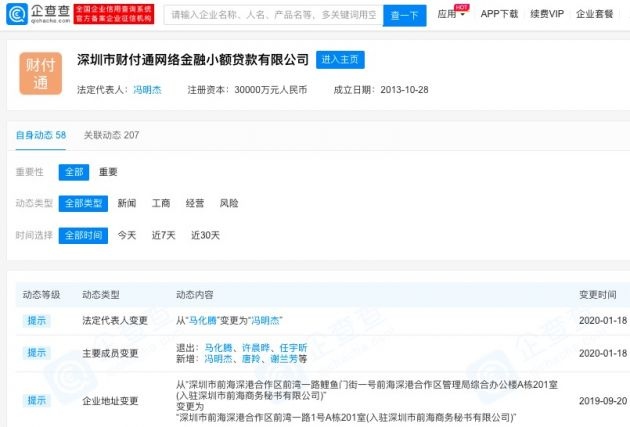 1月19日,企查查数据发表,近来工商信息显现,深圳市财付通网络金融小额贷款有限公司发作工商改变,马化腾卸职公司董事长和总经理,其间董事长由冯明杰接任,总经理由唐羚接任。