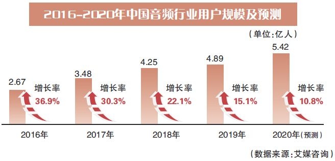 陈述闪现,2018年我国在线音频商场用户规划达4.25亿人,估计到2020年,用户规划将达5.42亿,但详细调查用户规划添加率,已从2016年的36.9%下降至2018年的22.1%,而2020年估计用户规划添加率仅为10.8%,这也代表着此前大幅添加的用户盈利正逐渐退避。
