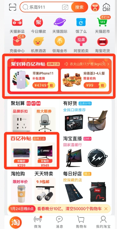 在手淘的巨大流量下,用户的感知和消吃力自然会提高。与之比较,商家的参与度显得愈加重要,这才是渠道取胜的关键因素。能够正常的看到,在聚合算百亿补助领域内,掩盖了从iPhone、戴森等头部尖货,到耐克、阿迪的鞋服,乃至于猪肉、牛排、进口车厘子、榴莲果肉等各类产品。