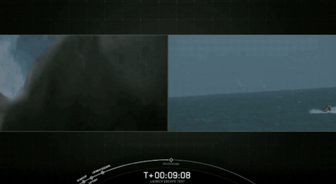 画面显现,发射约2分24秒后,已爬升至最高点的飞船扔掉其骨干段,由较小的“天龙座”推进器调整方向,使载人舱再入大气层,呈自由落体状向大西洋掉落。