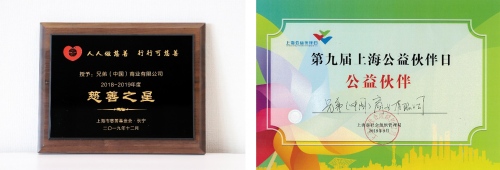在过去的一年,兄弟(中国)积极履行CSR活动,并荣获了上海市长宁区“慈善之星”、第九届上海公益伙伴日“公益伙伴”称号。