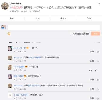 很多用户在夸张的广告刺激下,强撑着耐心完成着抽卡、集卡、做任务、玩游戏、答题等关卡后才发现,今年抖音的春节活动,不仅哄骗着众人挨个下载使用自己并不感兴趣的字节跳动系App,甚至连“分20亿”的金额似乎都有了水分,获取红包也是障碍重重,隐隐嗅出了一种“玩不起”的味道。