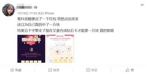 继去年抖音春节红包活动因涉嫌收集用户数据被不少用户吐槽后,近日,抖音春节红包卷土重来,没想到“砸重金20亿”的巨大刺激,却再度引发一片群嘲。