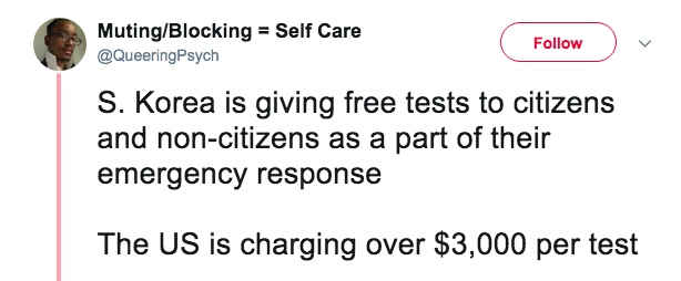 美国网友:韩国供给免费的(新冠病毒)检测,而美国收取3000美元的费用。社会化媒体截图