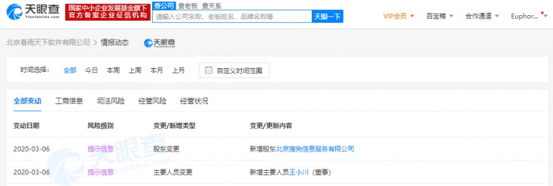 网易科技讯3月6日音讯,天眼查多个方面数据显现,近来,北京春雨全国软件有限公司发作工商改变,新增股东为搜狗的运营主体北京搜狗信息服务有限公司,与此同时,新增搜狗CEO王小川为公司董事。