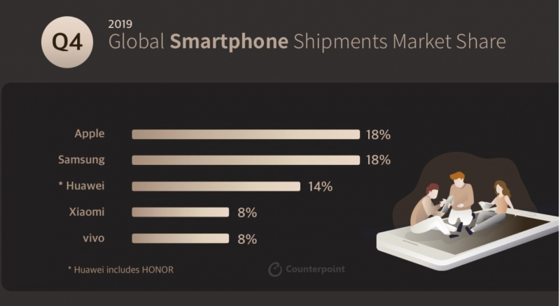 Counterpoint商场监测陈述数据显现,2019年第四季度,全球智能手机出货量同比增加2%,到达4.011亿部。苹果、三星、华为、小米以及vivo别离以18%、14%、8%和8%的商场芬恩,占有榜单前五。