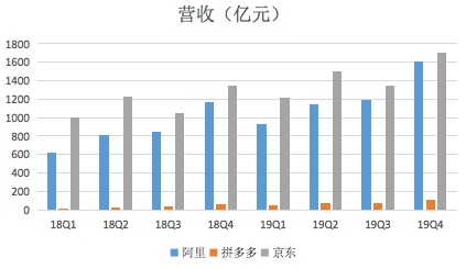 第四季度由于双11的加成,三家的营收都创下了新高。其中阿里四季度营收1614.56亿元,京东营收1707亿元,拼多多这边则显得有点单薄,营收为107.93亿元。必须要格外注意的是,京东营收比阿里高的原因,是因为京东将自营商品的交易也算在营收当中。