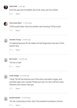 “TikTok让我有一种离开地球的冲动,被严重高估的app”、“我宁愿杀了我自己,也不愿再活一年目睹TikTok继续存在”其中两位请愿者控诉道,诸多过激的言语中,无不透露着他们绝望的心情以及对TikTok的厌恶。请愿发起人布莱森摩根称,抖音海外版反复多次推送3条广告视频刷屏进行视觉轰炸,上海消费者,并且导致友商投放广告十分困难,实属不正当的竞争行为。