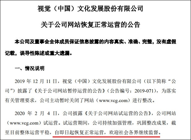 当天,视觉我国发表《关于公司网站暂停运营的布告》,为执行有关办理要求,暂时封闭网站整改。