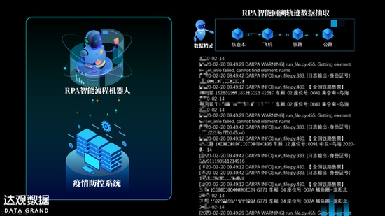 豁达数据使用RPA(流程自动化)机器人,完成对返岗人员活动信息的自动化收集、辨认与判别。返岗人员身份证放在警务核对终端上扫描一下,RPA机器人3秒钟内便能将其活动轨道上传至“疫情防控办理体系”,生成要点流入人员名单。