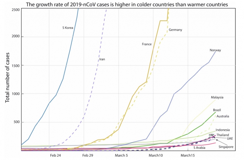 在3月11日至3月19日期间,Bukhari等人观察到,虽然中东、南美、亚洲和非洲国家(温暖地区)的病例数量激增,但它们仍然不到8℃-12℃之间地区的1/10。他们都以为,这种病毒在较温暖地区的这种增长是不太可能的。迄今为止的数据清楚地表明,温度高于17℃和绝对湿度大于9g/m3地区的病例数要低得多。