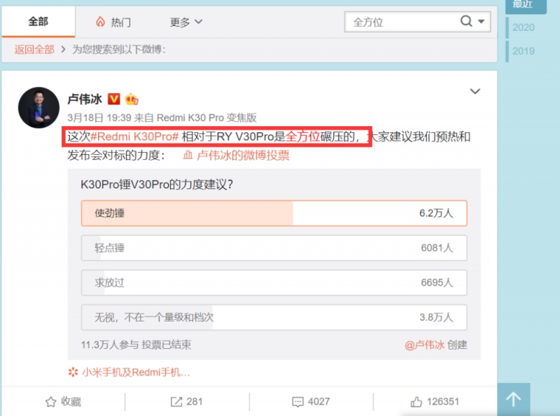 经过上面的剖析咱们得出结论,红米K30 Pro并不能做到全方位吊打荣耀V30 Pro,至少以上三点就没做到,因而小米高管说全方位碾压我以为是不恰当的,用多方面逾越V30 Pro或许更适宜些。关于荣耀V30 Pro和红米K30 Pro这两款产品,由于针对的用户集体不同,一千个人就会有一千种观点。站在我的视点动身,我以为他们俩都是不错的产品,当然客观来说K30 Pro的确性价比更高一些!