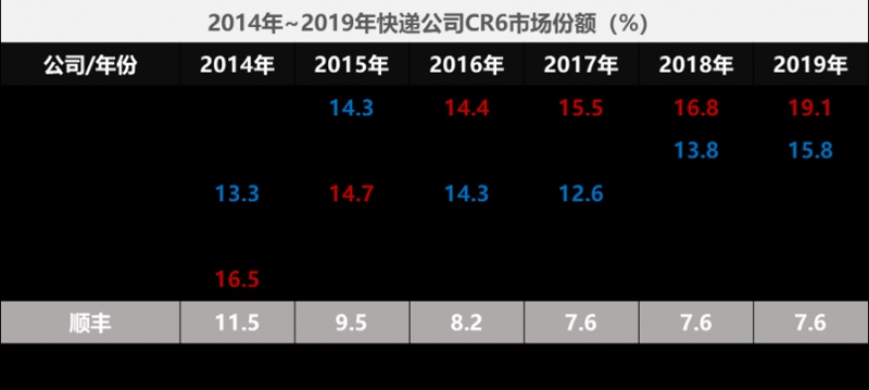 自2014年起,快递市场的格局趋于稳固,六大行业巨头(三通一达、百世、顺丰)占据70%的市场占有率。三通一达更是牢牢压制顺丰。2017年至2019年,顺丰市场占有率均仅排名第六。