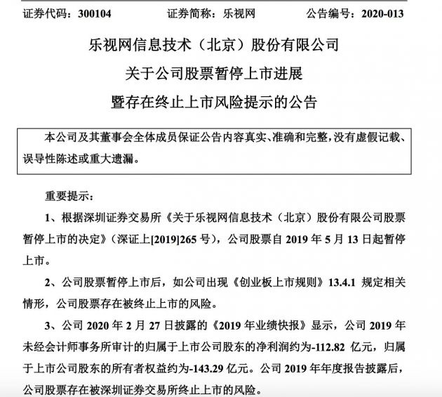 4月2日音讯,乐视网今天发布关于公司股票暂停上市发展暨存在停止上市危险提示的布告,布告显现,公司2019年未经会计师事务所审计的归属于上市公司股东的净赢利约为-112.82亿元,归属于上市公司股东的一切者权益约为-143.29亿元。公司2019年年度报告发表后,公司股票存在被深圳证券交易所停止上市的危险。