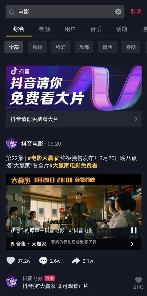 为了进一步发展长视频,字节跳动趁热打铁。上映两部撤档电影后,继续向外开放现有影视剧资源。如今打开抖音搜索“电影”,高分口碑、欢乐喜剧及浪漫爱情各种类型影片应有尽有,“短带长”的意味明显。而在这之前,“短带长”是西瓜视频的专属。
